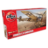 Airfix 1/72 Fokker E.II Eindecker Significant in the history of aerial warfare, the Fokker Eindecker was the first purpose-built First World War German fighter aircraft and the first to be fitted with gun synchronisation gear. This gear allowed the pilot to shoot through the arc of the propeller and in his line of sight. Once introduced, it took a withering toll on Allied aircraft. What's in the box? Plastic kit Instruction sheet Paint guide Decal Sheet