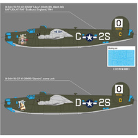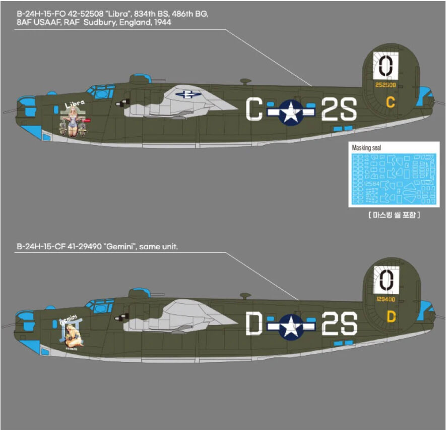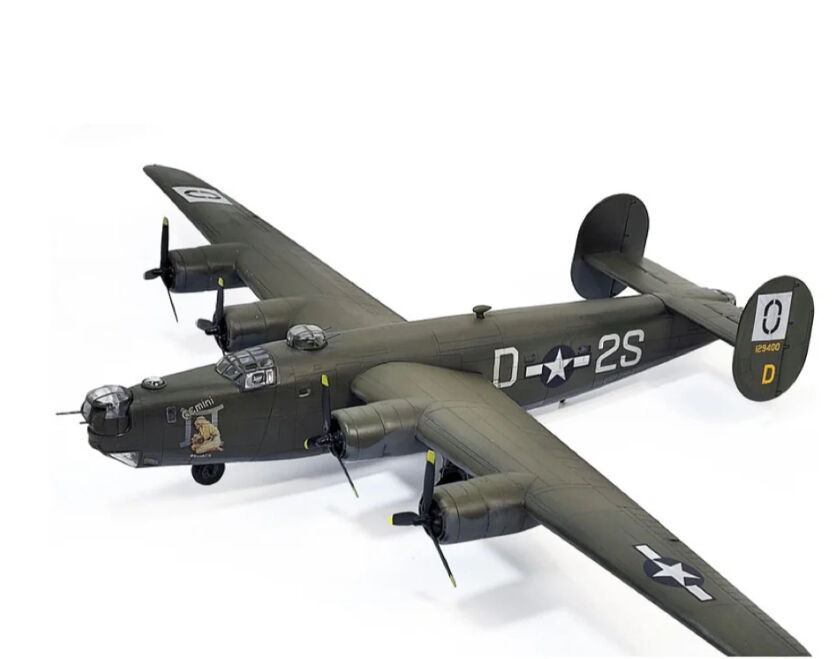 Heavy four-engined bomber used by the United States Army Air Forces in World War II. It was one of the most versatile and widely produced bombers of the war. The Liberators represented by the markings with this kit, "Gemini" and "Libra", were part of a group of Zodiac-named bombers that served with the 486th Bombardment Group, 834th Bombardment Squadron, and participated in numerous bombing missions over Europe. "Gemini" was later transferred to the 451st Bombardment Group and continued to fly combat missions until the end of the war. "Libra" was transferred to the 492nd Bombardment Group and eventually to the 406th Bombardment Group. It remained on the inventory records of the 492nd Bombardment Group in July of 1945.