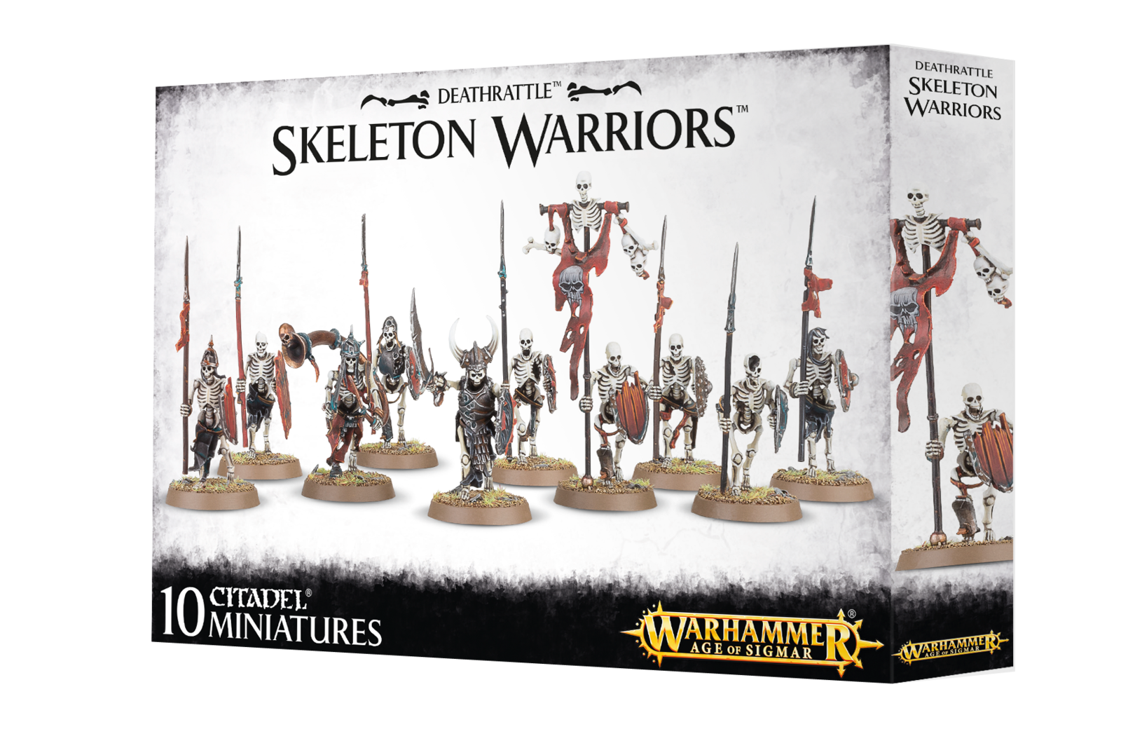 This multi-part plastic boxed set contains the parts needed to assemble 10 Skeleton Warriors wielding ancient blades or ancient spears, and includes the necessary parts to assemble 3 models as a champion, standard bearer and hornblower respectively. Supplied with 10 Citadel 25mm Round bases.