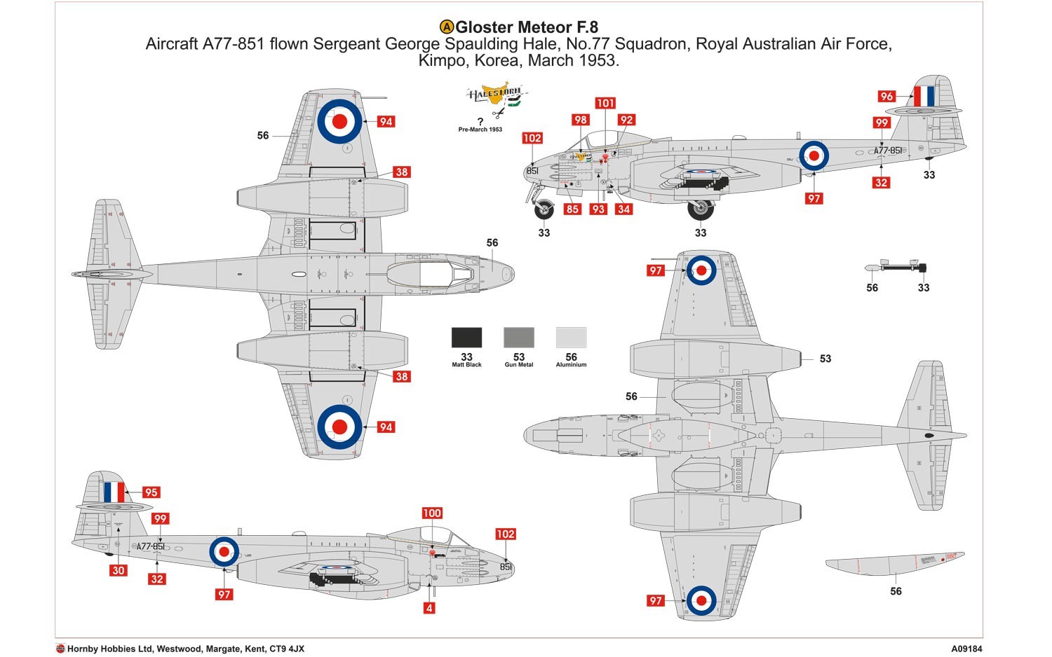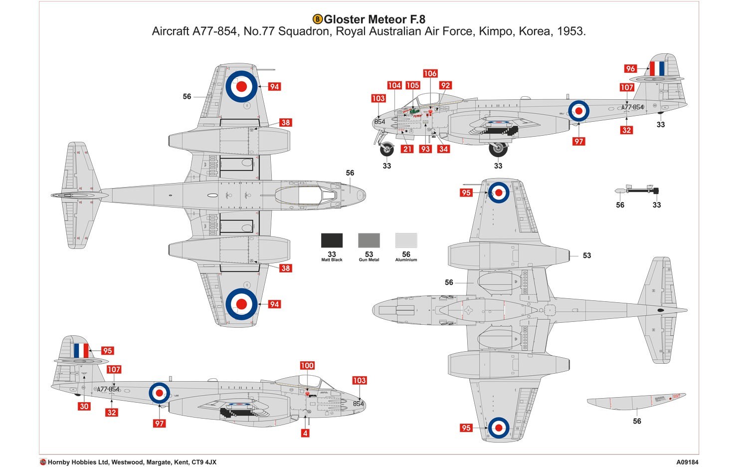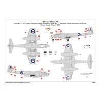 This kit also includes decals to represent the choice of two Meteors as flown by the RAAF N0.77 Squadron based at Kimpo during the Korean War.
