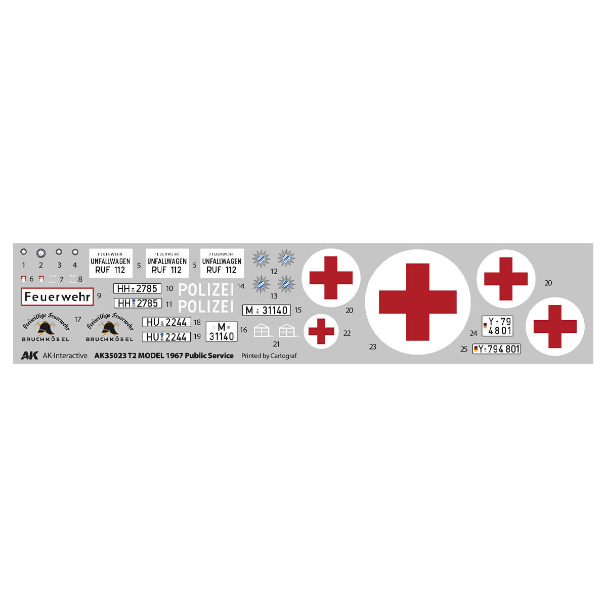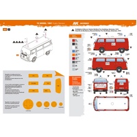 The reference AK35023 represents the bus version of the vehicle manufactured in Germany from 1967 until 1971, probably one of the most popular variants in use. Includes two variants of emergency lights and a roof-mounted ventilation fan. The decal sheet contains markings for one Bundeswehr, one police and two firefighter vehicles.