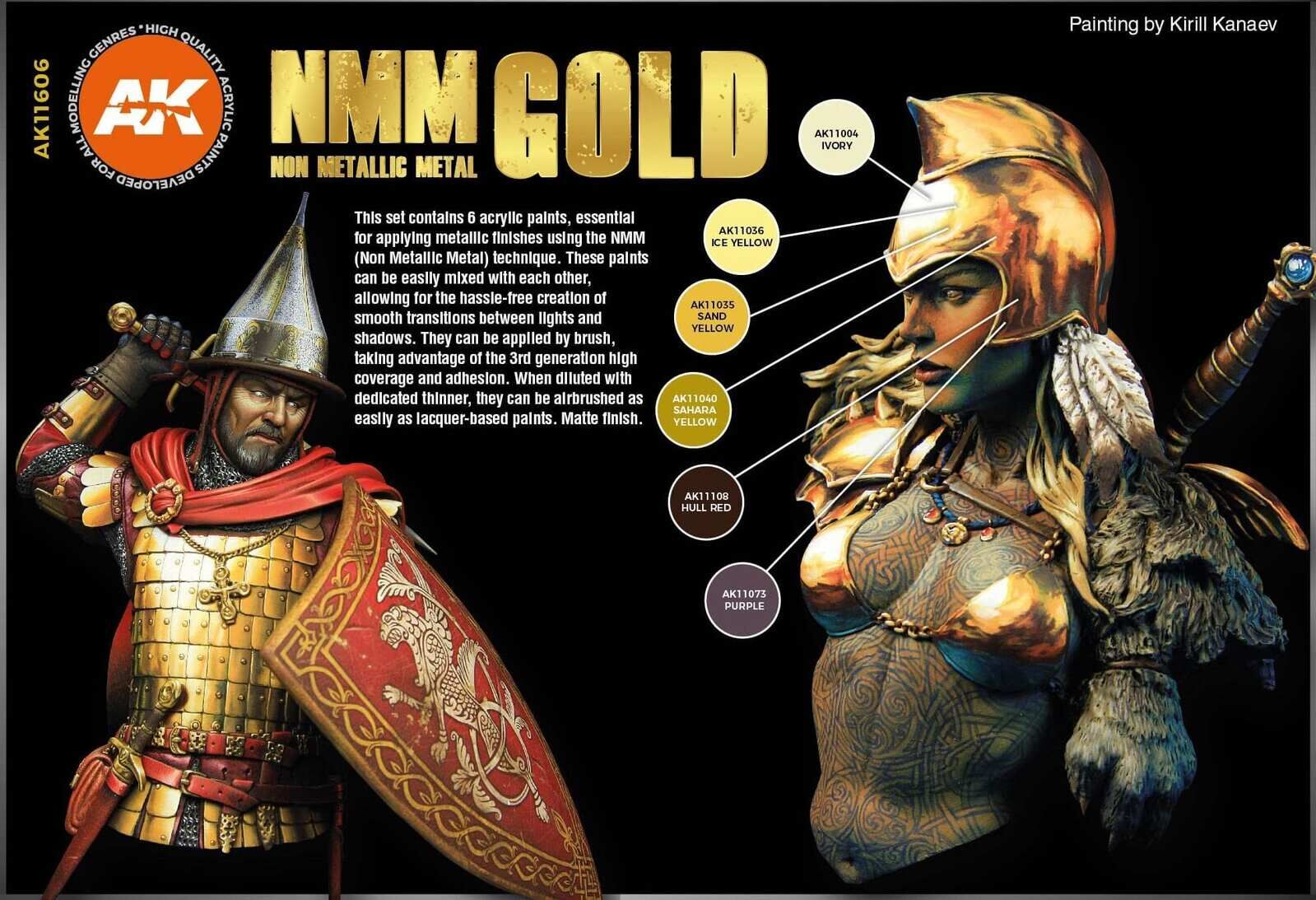 This set contains 6 acrylic paints, essential for applying gold metallic finishes using the NMM (Non Metallic Metal) technique.