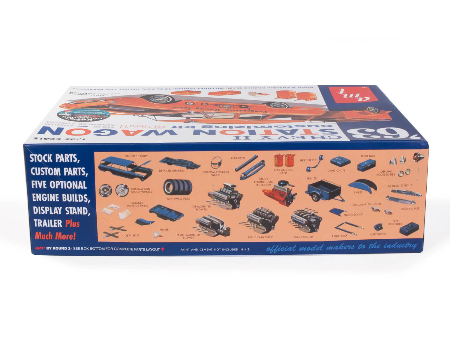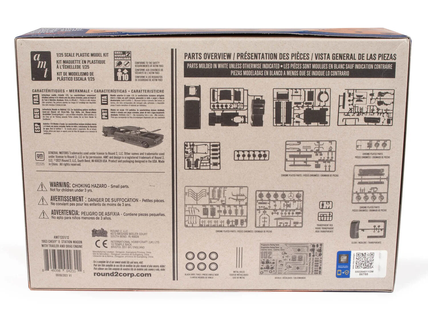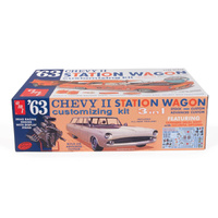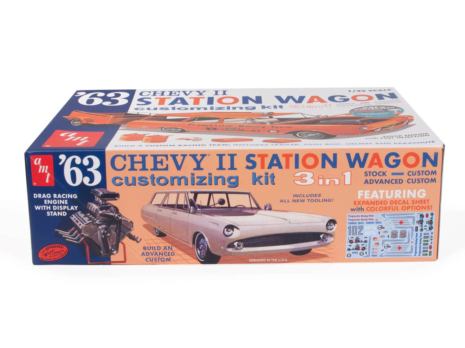 OPTIONS GALORE: The 1963 Chevy II Station Wagon customizing kit is loaded with options! Fully paintable, the model kit can be built as a stock, custom or advanced custom wagon. Features include: NEW tooling, pull-behind trailer, 5 engine options, engine display stand, whitewall tires, custom and stock chrome wheels, racing accessories, and a NEW water-slide decal sheet loaded with colorful options—all wrapped up in eye-popping, vintage-style packaging