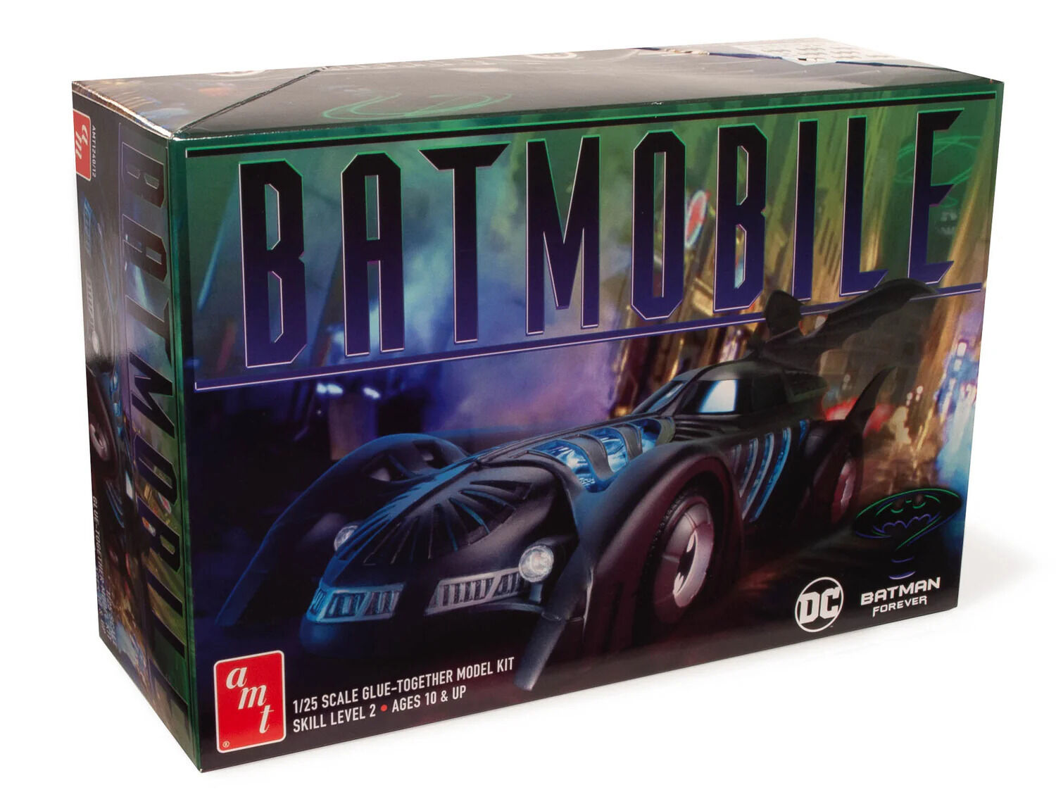 VILLAIN BEWARE! The 1/25 scale AMT Batman Forever Batmobile kit features removable canopy, open or closed rear fin, cut-out panels, rear turbine, chrome wheels & engine detail, tinted windows and detailed cockpit. Kit also includes cockpit & wheel decals in eye-catching packaging.