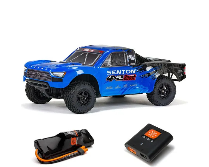 From beginner bashing to extreme all-road blasting, the Arrma Senton 4X2 BOOST 550 MEGA Brushed 2WD short course truck is a journey for anyone wanting to go faster than the opposition. The Armma Senton Boost package is easy to drive, affordably priced, and completely ready-to-run, as it includes a NiMH battery and USB charger. Check out the aggressive 1/10 scale RC short course truck styling for a hint of what’s in store. Speeds of 30+ mph are possible under optimum conditions. With its durable chassis, wide wheelbase, and vented tires, the Arrma Senton 4X2 BOOST puts the hammer down on nearly any off-road or paved surface, while its smooth handling has you looking like a short track RC winner straight off of the starting line. The ARRMA design team minimizes your maintenance downtime with an innovative modular chassis that gets you in and out of the pits ASAP. The choice of included Spektrum radio also makes this one of the best RC trucks for beginners. Besides having a grip that fits like a glove, it lets you limit top speeds to 50% or 75% of full throttle until you’re ready to put the pedal to the metal. You won’t always be a new driver, of course, and the brushless-ready design of the Arrma Senton 4X2 BOOST SCT RC truck lays the perfect foundation for your next moves. Make and break new speed records with an easy upgrade to 3S brushless power. Install the Arrma 4X4 BOOST Transmission Upgrade Set (ARA210003, sold separately) in a few simple steps for unstoppable 4WD traction! 4x2 transmission 2-wheel drive that you can upgrade to 4x4 with the BOOST Transmission 4x4 Upgrade Set (ARA210003) Set your throttle modes to 50/75/100% on the 2.4GHz Spektrum SLT2 transmitter SLT 2-in-1 Spektrum Receiver and 40A ESC 3300mAh 8.4V Spektrum Smart Hump NiMH Battery S120 USB-C Spektrum Smart Charger Includes AA transmitter batteries 12T MEGA 550 brushed motor S650 waterproof digital Spektrum servo giving 84 oz-in of torque Internal metal-geared diff Extended height dirt defenders on strong composite chassis Bumpers for impact absorption Stone clearing steering system Modular design for easy access to diff, electronics and power modules making for quick and easy maintenance Superb handling from the front and rear double wishbone suspension 1.35 module input and main diff gear teeth Water dispersing dBoots Fortress MT vented tyres for maximum durability Limited 2-year warranty – details are on the Arrma website.
