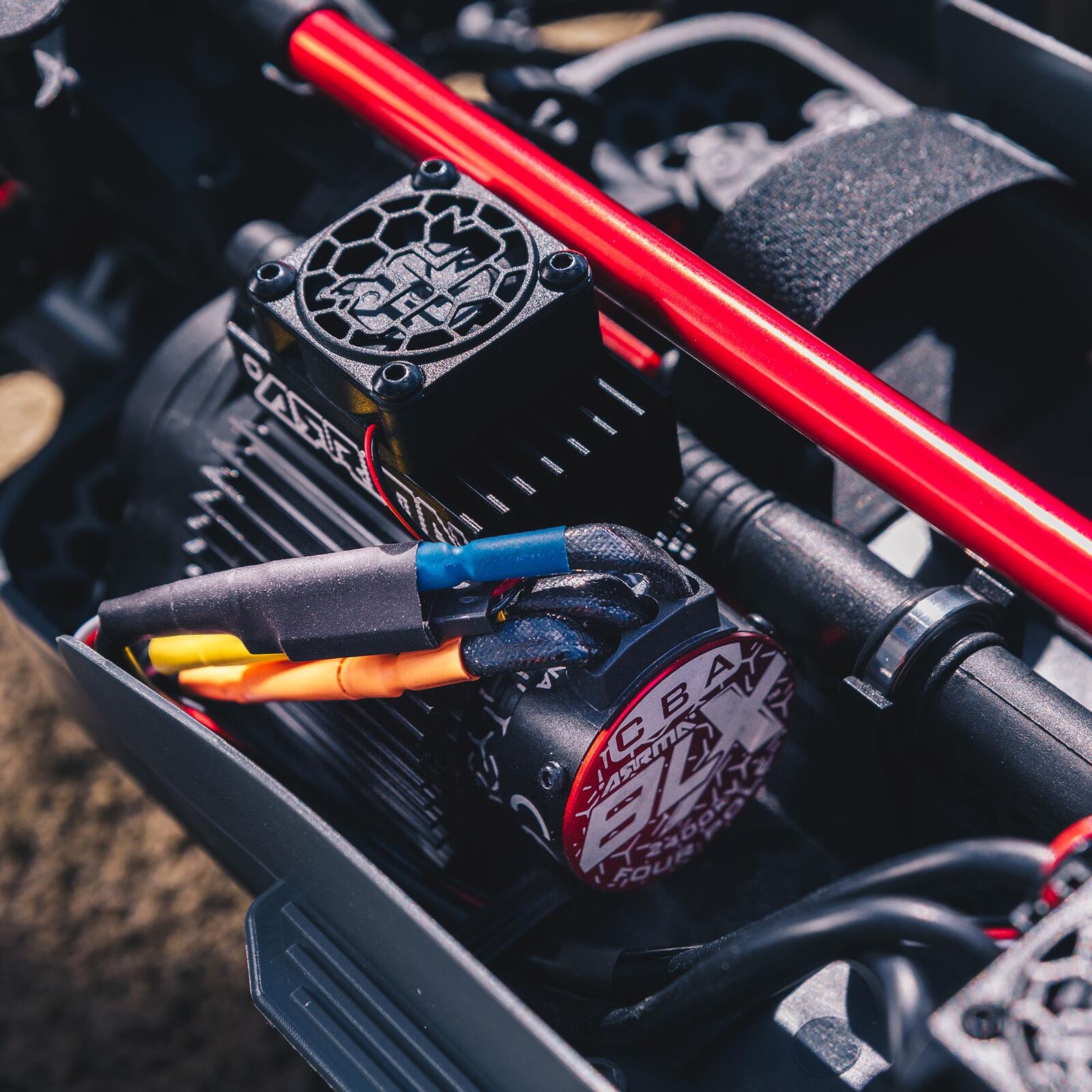 The body has the same aggressive styling as that of the KRATON™ 6S BLX, with a smaller version of its rear wing. There are also many subtle tweaks that give the KRATON™ 4X4 4S BLX a personality all its own. Large, tough wheels hubs and durable 17mm wheel hexes hold standard 3.8" wheels, outfitted with low-profile MINOKAWA LP tires.