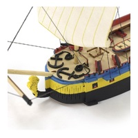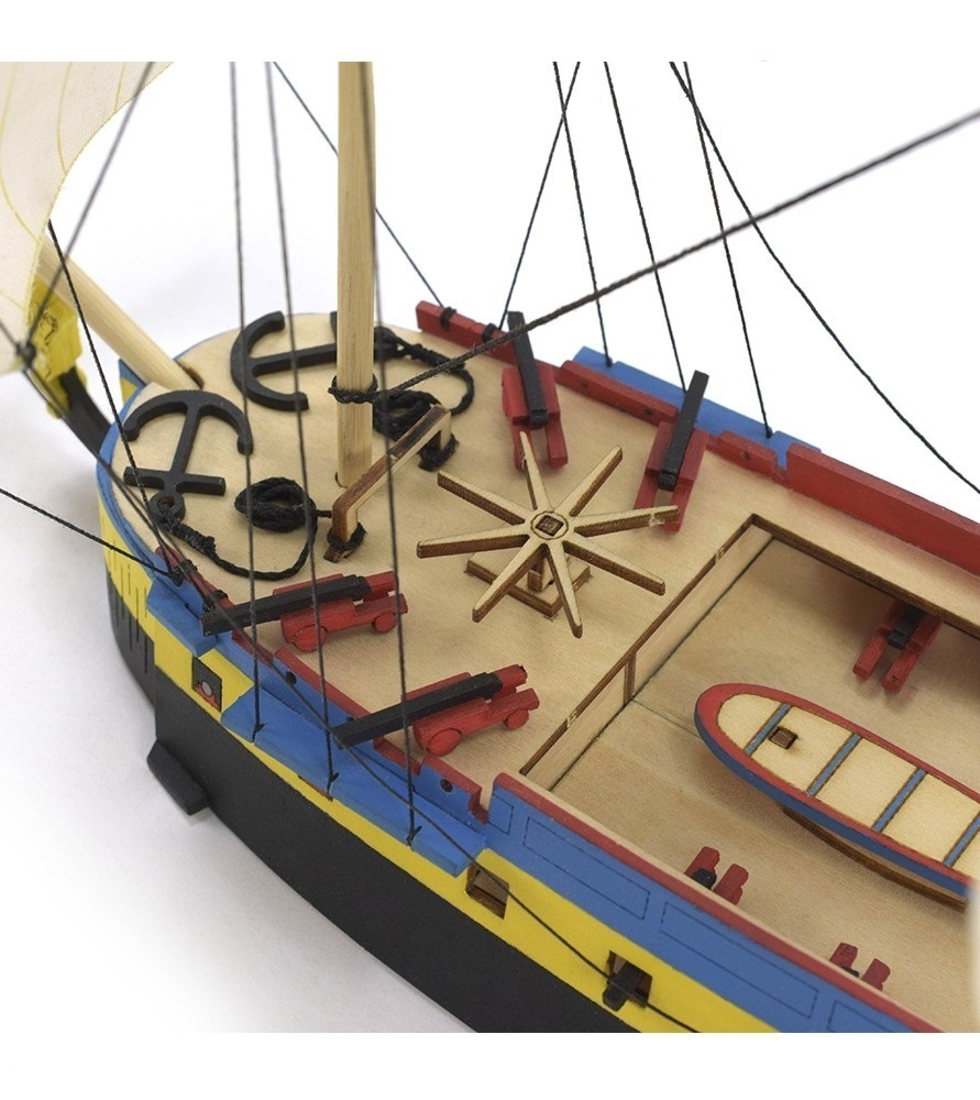 The box of Hermione La Fayette includes all the necessary parts to build the model, a total of 120. There are new parts cut by high-precision laser that allow an extraordinary fit, thus facilitating the assembly process. In addition, it contains printed sails, threads, lifeboat, cannons, flag, stickers, glue, paints and brush.