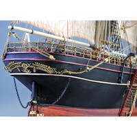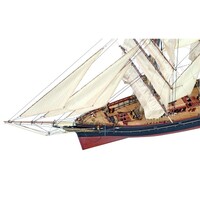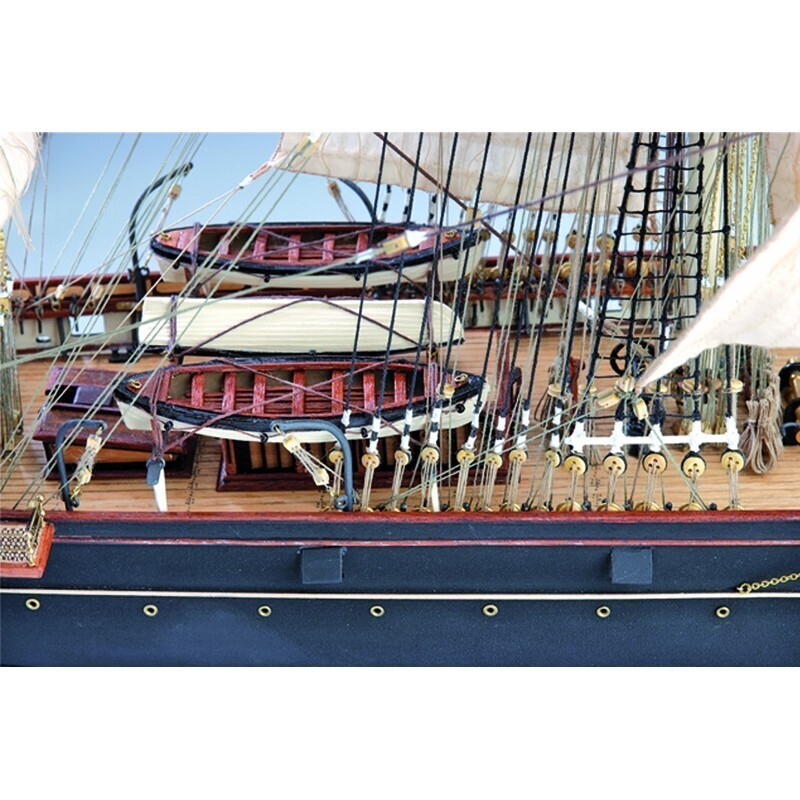 New wood kit Cutty Sark by Artesania Latina features single plank-on-bulkhead construction with pre-cut wooden parts. You...ll plank the hull with individual mahogany strips, while limewood planking covers the deckhouse and decks. Fine African walnut is used for keel, stem, waterways, coamings, hatch covers, door frames, masts and yards. Hardwood fittings include deadeyes, blocks and cleats. Brass is plentiful in the form of stanchions, rings, belaying pins, eyebolts, navigation lights and housings, rudder hinges, chain, bell, chimney and mastheads. Anchors, bitts, boats, boat frames, davits, signaling cannon, life rings, figurehead, trusses, hoops and other parts are cast metal. Rigging line is supplied in a variety of sizes, and cloth flag and pennants add realistic detail. Six large sheets of plans, 36 page book containing 120 color photos of every phase of construction and English instructions.