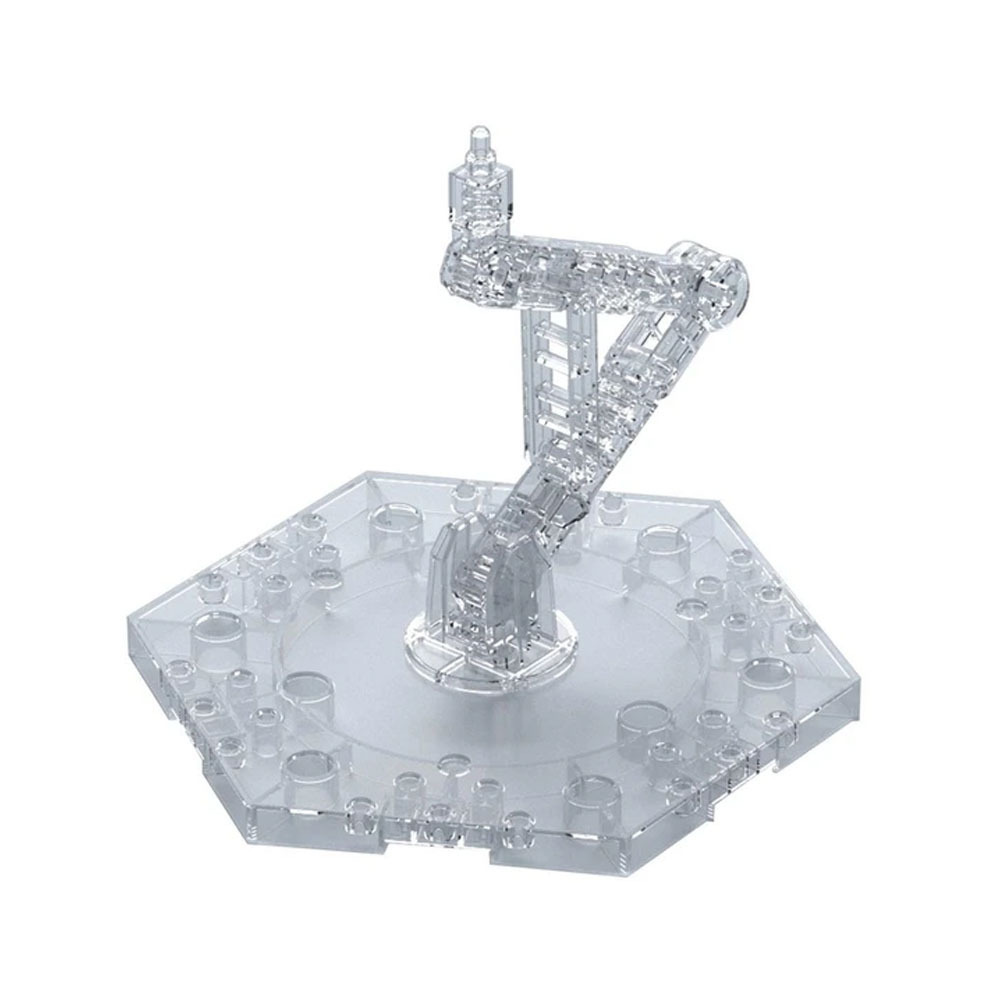 Bandai Action Base 5 Clear Bandai's Action Base is designed to hold kits from their SD Gundam, 1/144 scale models, HGUC, HG Gundam Seed, 1/100 scale models, MG, and Real Robot Revolution series. No other display bases from other companies come close what this amazing display base allows you to do. Action Base 1 is a plastic injection snap-fit assembly kit that requires very little work to assemble. No cement or paint required. The octagon base and the square part that can be connected to any one of its sides come with cool mechanical detailing and panel lines, plus a total of 10 holes for placing the support pole for the main stand to adjust the main stand's height. The support pole has an ingenious locking mechanism that allows it to extend or retract and is strong enough to hold the main stand in place. The main stand itself can also be extended upwards to pose your kit in a much higher position. Features: Includes long base arm, base, and 2 runners Measures 5 inches (12.7cm) 1/144 scale Action base for 1/144 scale figures Compatible with Figure-rise effect parts and Action Base 4