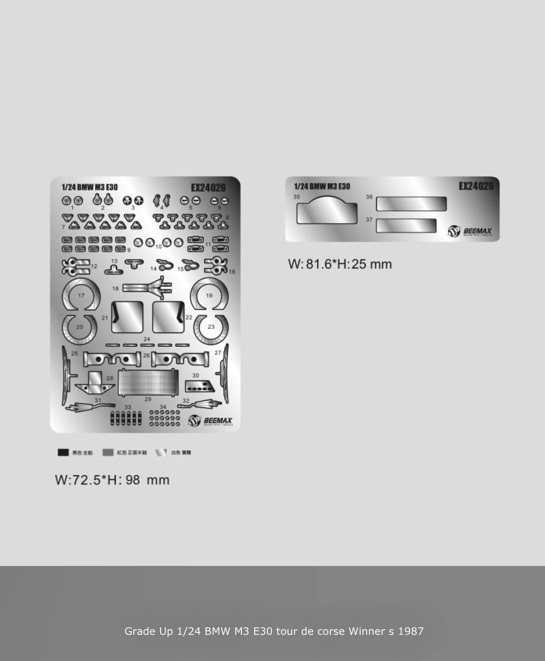 Photo-etched plate and other details to use with the Beemax kit of the rally version of the BMW M3 E30. 24029