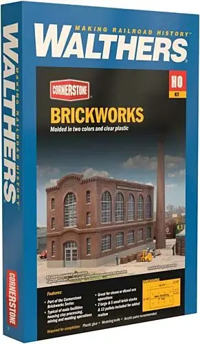 Bring a classic industry to your HO layout with the Cornerstone Brickworks Series. Typical of facilities producing brick and similar products from the 1880s to the 1990s, the series includes four authentic structure kits, sized to model a complete operation on most layouts as well as accessories. Perfect for modeling various sorting and other in-plant facilities as well as transfering finshed bricks from trucks to boxcars, the Cornerstone Brick Storage Building features: