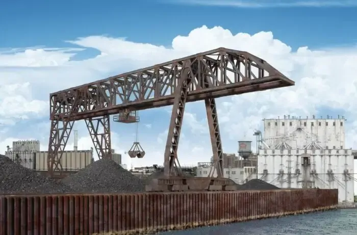 The Walthers Cornerstone HO Scale Bridge Crane is an ideal addition to waterfront industrial or transloading scenes on your railroad. Coal is the life-blood of any coke or gas works and a ready supply is always needed. Many plants were located alongside waterways, which allowed massive amounts to be delivered by ship. To reach into their holds, special bridge cranes with longer booms extending beyond the dock were used. These made quick work of unloading using a large clamshell bucket to stockpile coal nearby. At steel mills these big cranes were also used to unload limestone; at other docks they were used for handling aggregates and ores. This impressive kit has a modular design and additional parts so you can build a longer or shorter version to fit your available space. With its superbly detailed steel truss work, operators cab, clamshell bucket, trolley and more, it will be a focal point of any scene. On the waterfront, it makes a great stand-alone coal or aggregate dock crane, and its a natural at a steel works handling iron ore, coal, and stone.