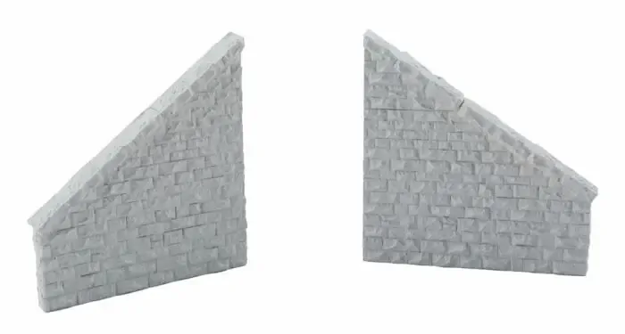 The Walthers Cornerstone Railroad Bridge Stone Wing Walls are just the thing for adding retaining walls against your railroad's bridge abutments. Based on typical cut-stone wing walls used from the 1800s on, this cast-resin wall set is layout-ready and features highly detailed stone surfaces with realistic color and texture. As shown, this Railroad Bridge Stone Wing Wall set includes one left and one right angled wall and each measures: 3-3/4 x 7/16 x 4" 9.5 x 1.1 x 10.1cm.