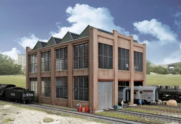 Without the car shop, a railroad just doesn't run. Big enough to look right, small enough to fit steam- or diesel-era layouts, this model is packed with features. Detailed brickwork, an authentic saw-tooth style roof with skylights, separate windows, roll-up doors, openings in the floor for rail, everything right down to the decals, is included. The basic Car Shop kit as shown builds a three-stall shop measuring 11-5/8 x 8-13/16 x 7-5/8" 29.5 x 22.4 x 19.4cm. Track center lines 2-3/4" 70mm.