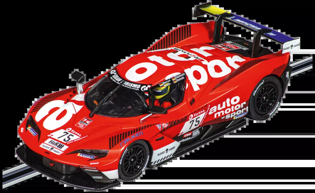 This race rocket with the number 75 is in action all over the world, and the 1:32-scale replica can now tear around Carrera circuits everywhere. The original KTM reproduction license guarantees an unbelievably precisely replicated slotcar with unsurpassed aerodynamics. Fans will be thrilled by the realistic front, rear and brake lights.