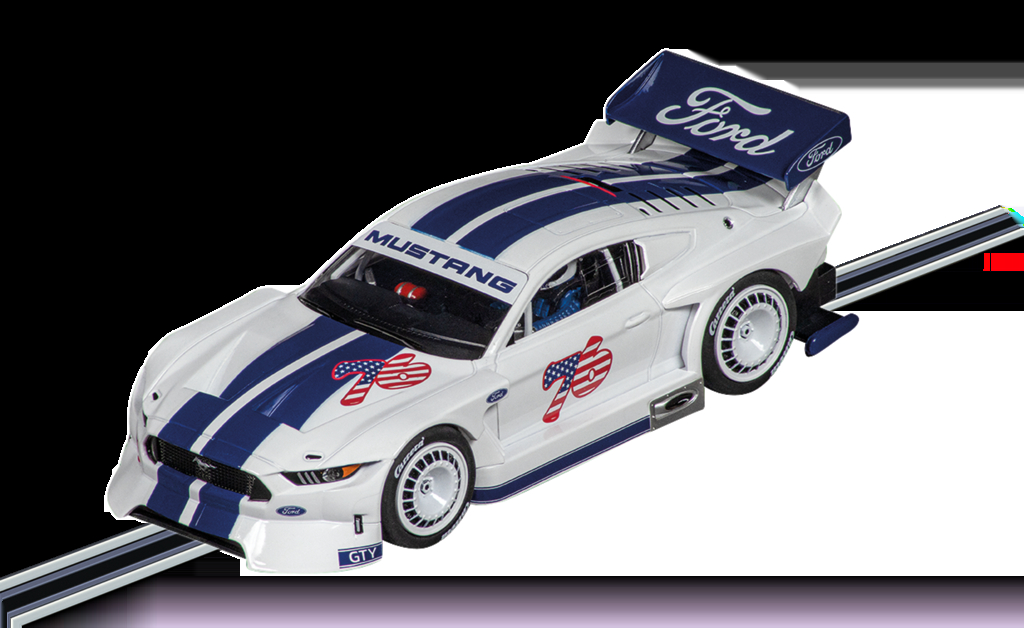 The Ford Mustang GTY ‘No.76’ hits the Carrera EVOLUTION racing circuit at full speed. This popular Ford Mustang sports car has been built by the US Ford Motor Company since 1964, and has long since become a major favourite among enthusiasts. The GTY boasts an incredible 5-litre V8 engine with a power output of up to 710 hp; so it’s a real battle-ready beast out on the track. Carrera’s grid set-up now also features the dream car Ford Mustang GTY with the number 76.