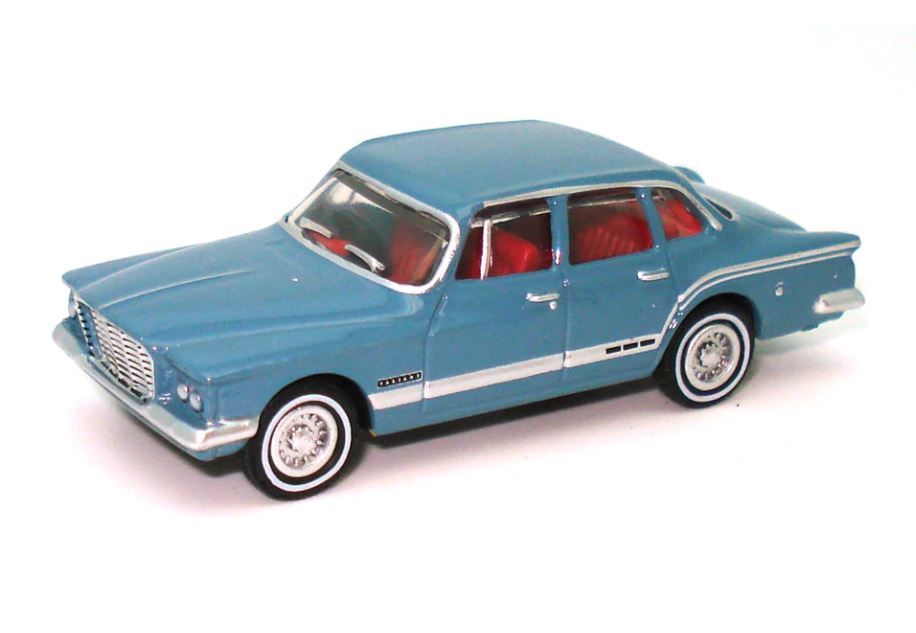Beautifully detailed all metal (even the baseplate) 1:87 scale or HO gauge 1962 Valiant S Series sedan - Gambier Blue. Limited run of just 2,000 pieces worldwide. Complete with acrylic display case.