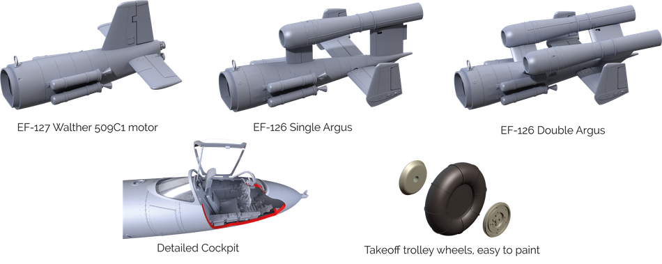 While the Ef-126 / Ef-127 never served in combat, we believe it is a beautiful aircraft design that would have looked quite attractive in a variety of late-war paint and mark­ings schemes, and so we have included 7 different markings options and paint schemes. While the decal placement and profiles show the Ef-126 Dual Argus configuration, the markings can be applied to any version. We hope you will have fun letting your imagination soar a bit and will explore the possibilities.