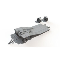 The front tow-bar is moveable, the front axle can be rotated, the upper ramps can be re-posi-tioned to the rear of the vehicle in a loading configuration (or the small, alternate ramps can be used and the forward ramps can be left in place, as is seen in some photos), the lower for-ward ramps can be installed in the stowed or raised configurations, and the rear axle can be left off in the loading configuration.