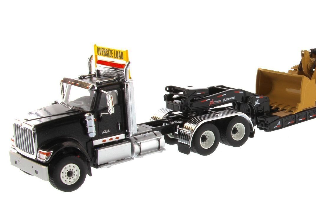 Diecast Masters - 1/50 International HX520 Tandem Tractor + XL 120 Trailer, Black w/ Cat 963K Track loader loaded including both rear boosters