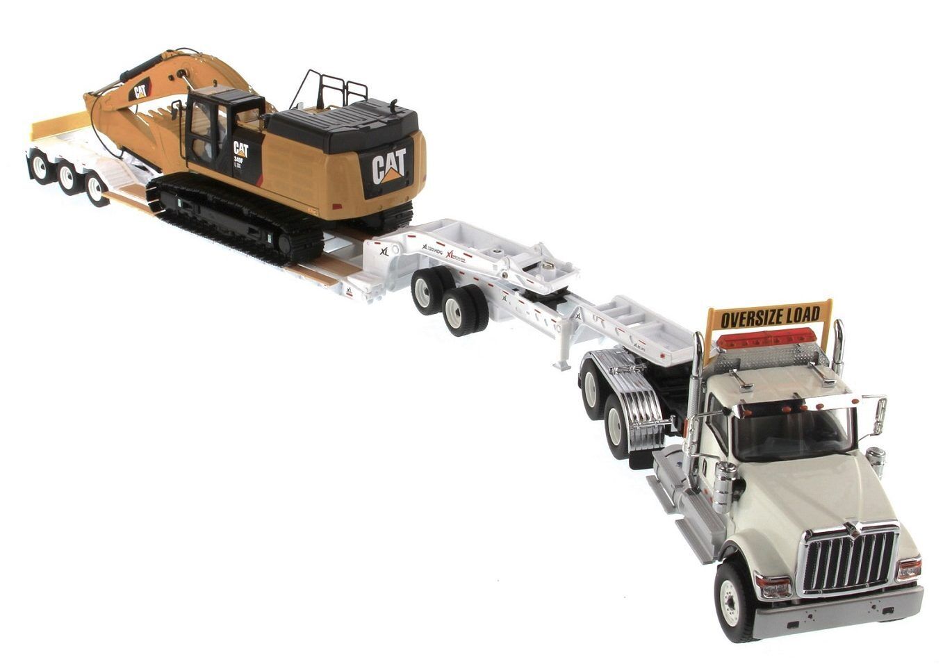 Diecast Masters - 1/50 International white HX520 Tandem Tractor + XL 120 Trailer outriggers, w/ Cat349F L XE Hydraulic Excavator load including both r