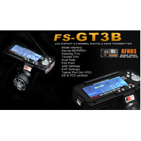 The Flysky FS-GT3B is a 3-channel wheel type transmitter built for cars and boats. This radio offers a clean, clear interface and many great features normally found in much more expensive radio's: Backlit LCD screen 10x model memory ABS braking All digital controlled end points, exponential, dual rates, trim and servo reversing full-angle gain antenna. The transmitter is supplied with a Flysky GR3E receiver. Features: Channels: 3 Model: car, boat Model memory: 10 Wireless frequency: 2.4GHz Transmission power: <20 dBm Wireless protocol: AFHDS Range: 100 ~ 200m (ground) Channel resolution: 1024 Battery: AA x 8 Charging port: None Low voltage alarm: <9V Antenna type: external single antenna Display: HTM blue film negative display, LCD white backlight Data port: phone jack (PPM) Temperature range: 0 ℃ — + 60 ℃ Humidity range: 20% -95% Online update: No Color: Black Dimensions: 155 * 125 * 270mm Weight: 397g