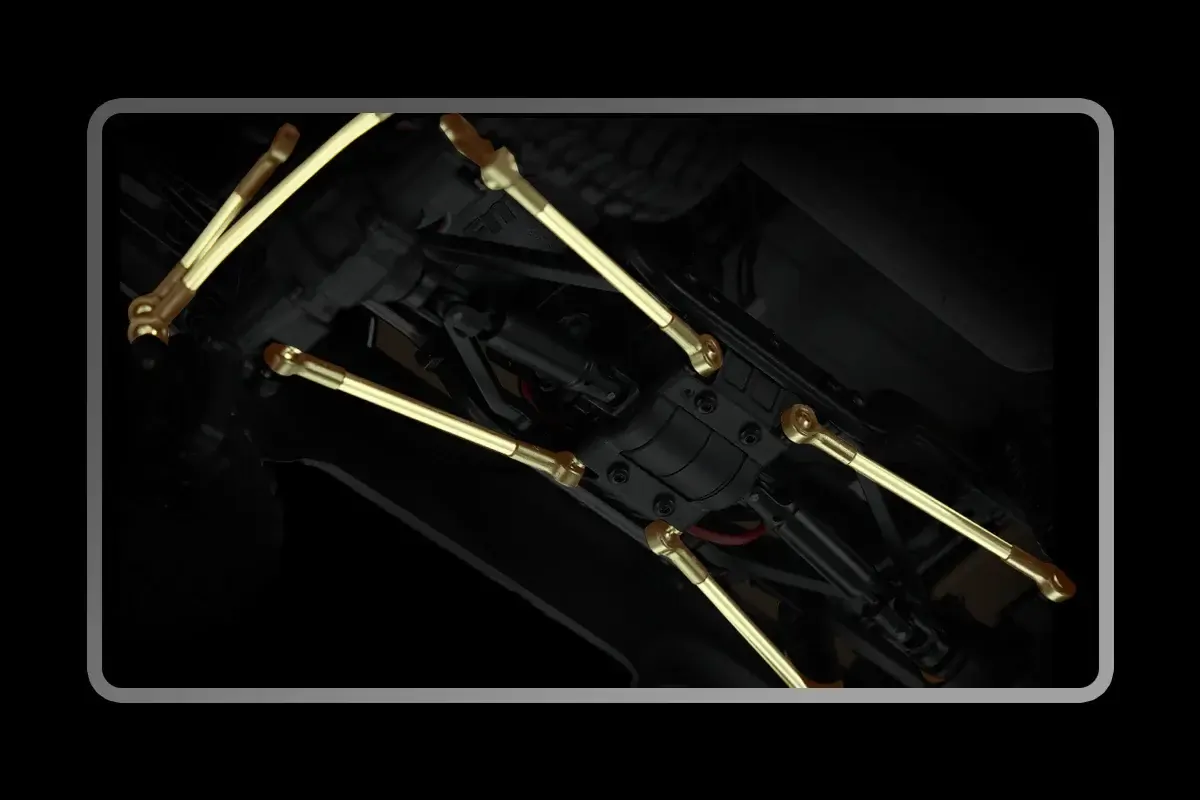 The rugged chassis construction of the FCX18-LC80 provides excellent strength and durability. It can withstand strong impacts and heavy loads, and the optimized design of the chassis safeguards the stability and reliability of the vehicle, allowing the car to stay steady in all kinds of terrain and conditions, enjoy the challenge, and enjoy an unparalleled off-road experience. What's more The new FCX18 series is equipped with precisely tuned metal hydraulic shock absorbers, which bring more stable shock absorption and buffering capabilities than the FCX24 series, and restore the excellent driving posture of the real car to a higher degree.