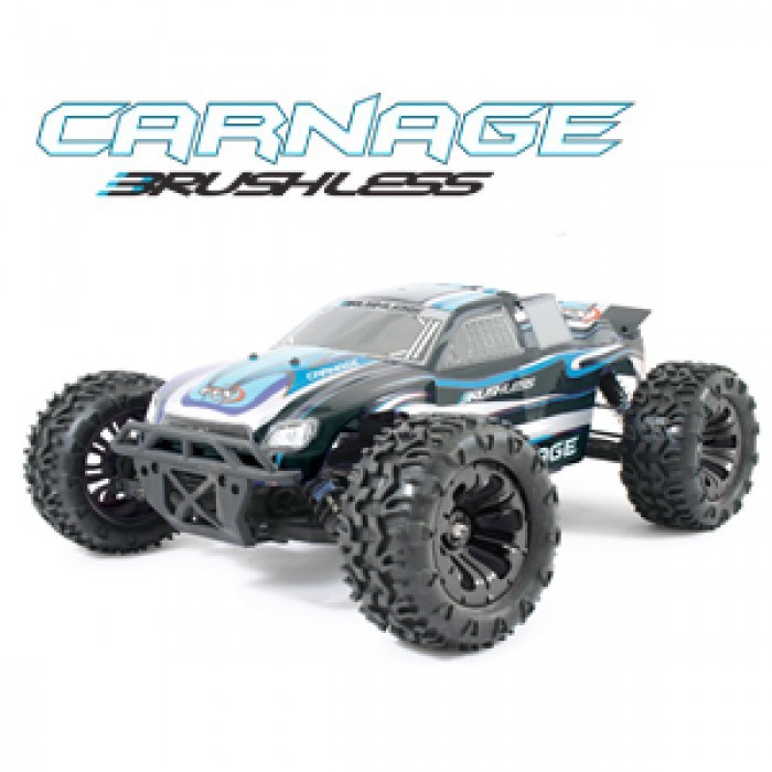 Our favourite car is now even faster! This Carnage is brushless powered for speeds up to 60kph when you tear up the neighbourhood. The Carnage is a great all-round design for any backyard due to it's truggy design. Big wheels, plenty of ground clearance and a durable chassis that keeps it racing for longer. Ready to run, includes radio, battery and charger Etronix EX2 Sport 2.4ghz radio Etronix 60Amp Photon sensorless brushless speed control Etronix 2950KV sensorless brushless motor Etronix Pocket Balance charger Voltz 3250mah 7.4v 20c LiPo Hard cased Big bore oil filled adjustable shocks Gearbox metal crown & pinion gear Front universal driveshafts Adjustable wheelbase Adjustable turnbuckles Fully adjustable suspension including, droop, camber, toe-in, wheelbase etc Slipper for drivetrain damage protection Voltz LiPo charge sack Race designed low profile pre-painted bodyshell Chassis accepts NiMh or LiPo battery 3kg steering servo Moulded tub chassis body 4wd shaft drive with slipper system Unique gearbox design for low CG Lightweight high impact arms