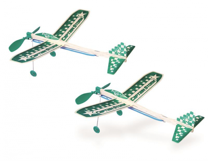 Two Captain Storm propeller planes allows for twice the fun. These 12" wingspan planes not only have propellers for long flights but also wheels for off the ground take offs and soft landings!