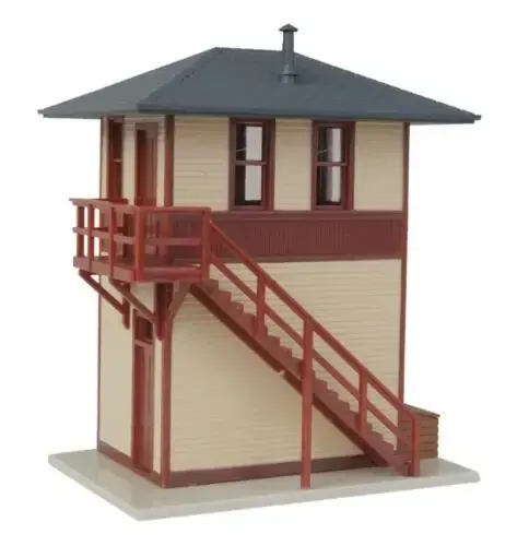 The WalthersTrainline Trackside Signal Tower is based on typical railroad interlocking towers along railroad lines across the continent. Featuring a wood exterior, this fully assembled model is an instant detail for railroad yards, junctions and other busy locations. This building features parts molded in appropriate colors so there's no painting needed. Features include factory-installed windows, a detailed exterior stairway and a small storage box. This tower is ready to use in any scene along your steam- or diesel-era railroad.