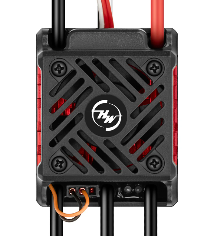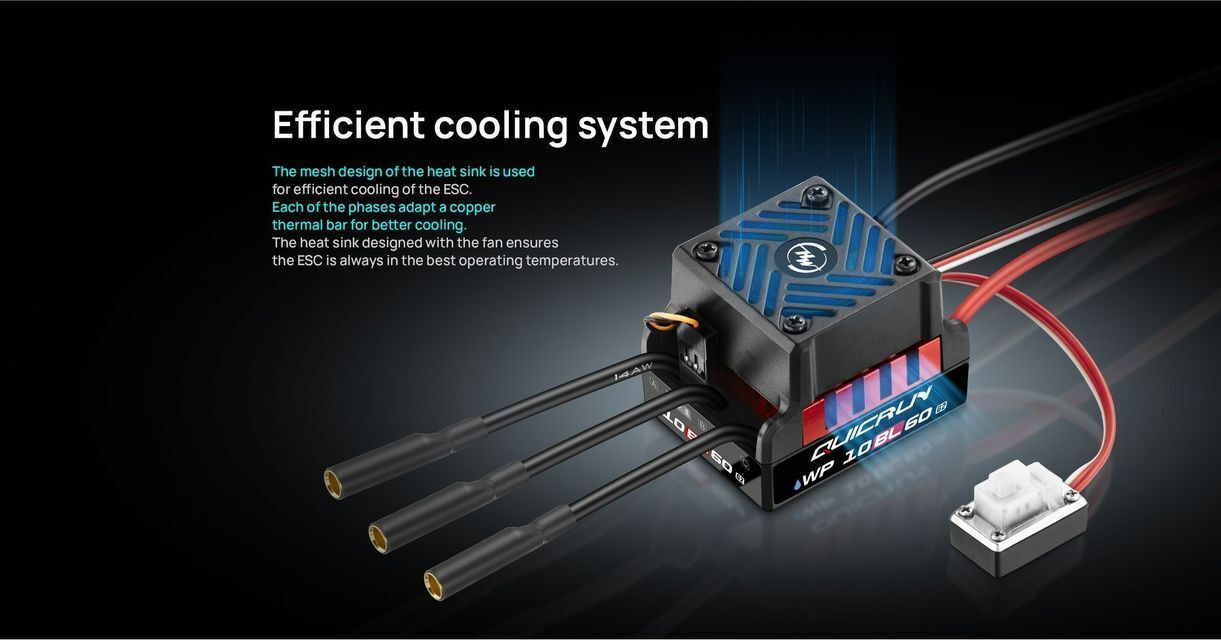 • Efficient Cooling System:The heat sink's mesh design efficiently cools the ESC. Copper thermal bars on each phase enhance cooling, while a fan ensures optimal operating temperatures.