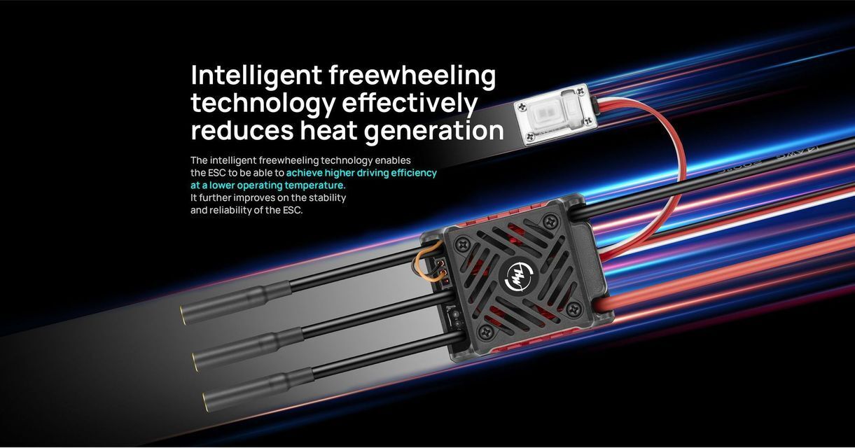 • Intelligent Freewheeling Technology:The intelligent freewheeling technology enables the ESC to achieve higher driving efficiency at lower operating temperatures, improving stability and reliability.