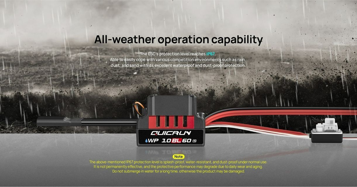 • All-Weather Operation Capability:With an IP67 protection level, the ESC excels in various environments, including rain, dust, and sand, thanks to its excellent waterproof and dust-proof features.