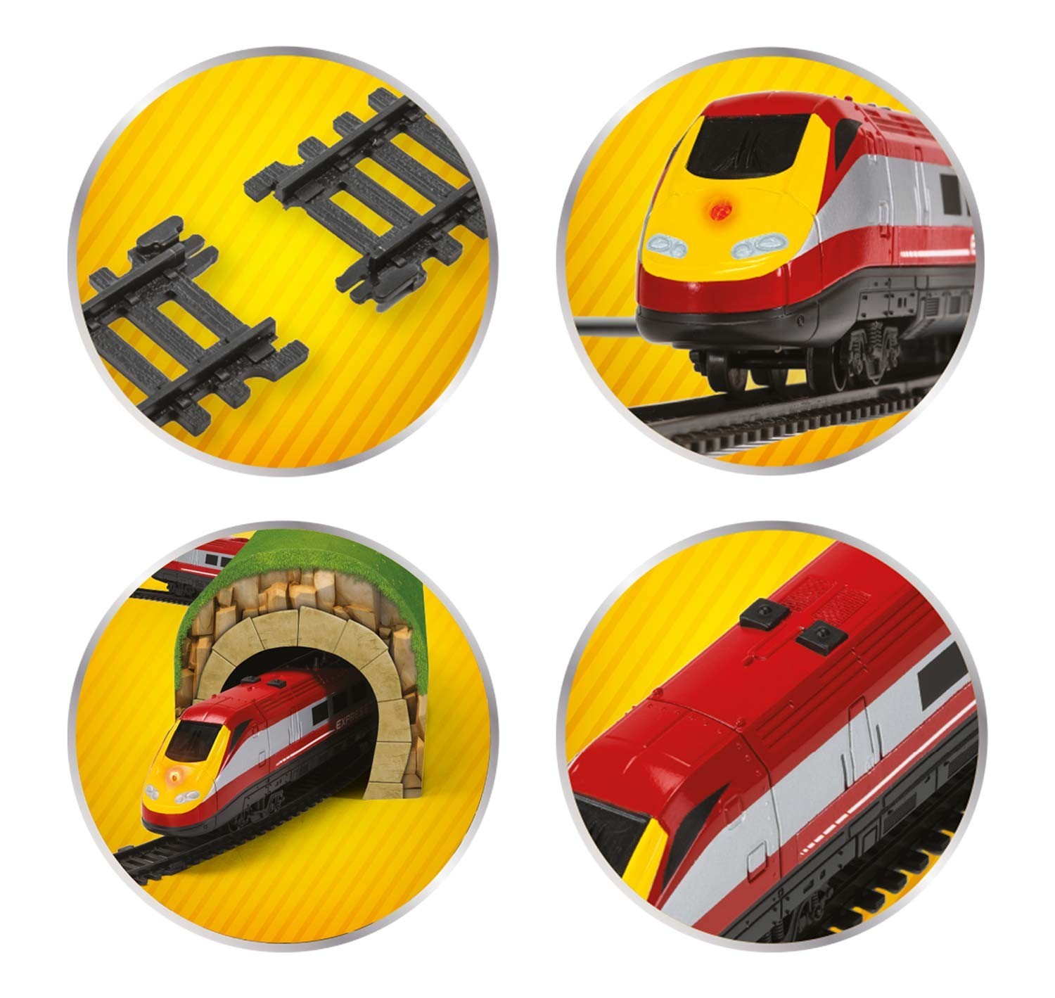 Simply fit together thetrack and scenery, fit the batteries and press the start button on top of the train and create your own railway adventures with this high speed Express Train!