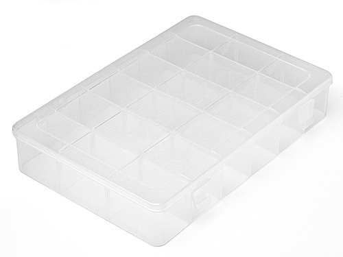 Keep your spares tidy and organised with this clear parts box. Equipped with adjustable dividers to give you the storage space you require and includes a decal sheet for personalization.
