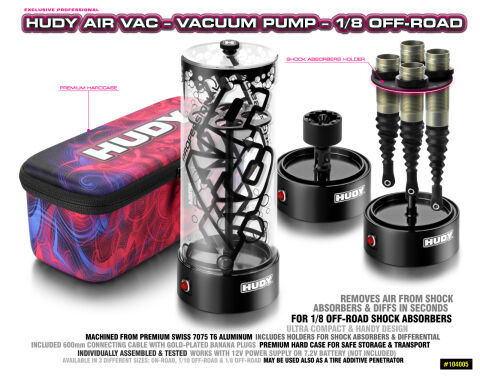 Air Vac includes strong & effective vacuum pump that is powered by 12V power supply or 7.2V battery (not included). Includes holders for shock absorbers and differential, 600mm connecting cable with gold-plated banana plugs. Comes in a premium hard case for safe storage & transport.