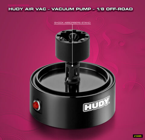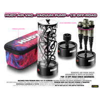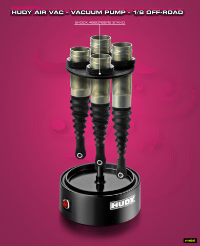 HUDY Air Vac is a handy, ultra-compact electric-powered vacuum pump for 1/8 off-road shock absorbers, developed to quickly & easily bleed unwanted air bubbles from oil-filled shock absorbers and differentials. May also be used as tire additive penetrator to help penetrate additive in the small pores of the foam tire. Well penetrated tire works better and last longer. Electrically operated, simple operation. The shock holder plate features 19mm holes for the shock absorbers.