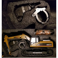 Your control station will be an intuitive 2.4 GHz radio control with LCD display. With it you will manage all the movements, you will activate the sounds, the lights on the arm and the smoke generator, moreover the comfortable LCD display will show you the battery status of the model. The controls are ergonomically positioned according to the standards of real excavators and you will be able to manage movements simultaneously and effortlessly. And to increase even more the realism, the model is also equipped with a really working demolition hammer and a selector that can be interchanged with the bucket.