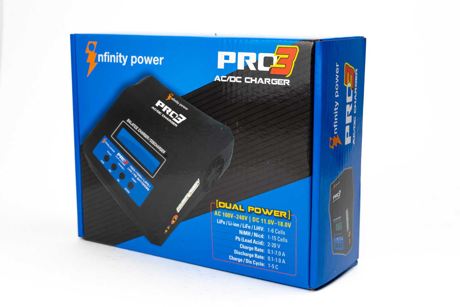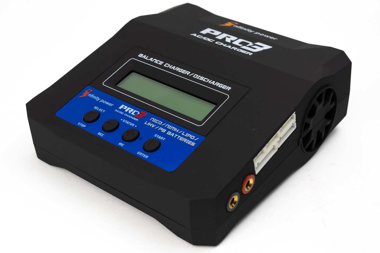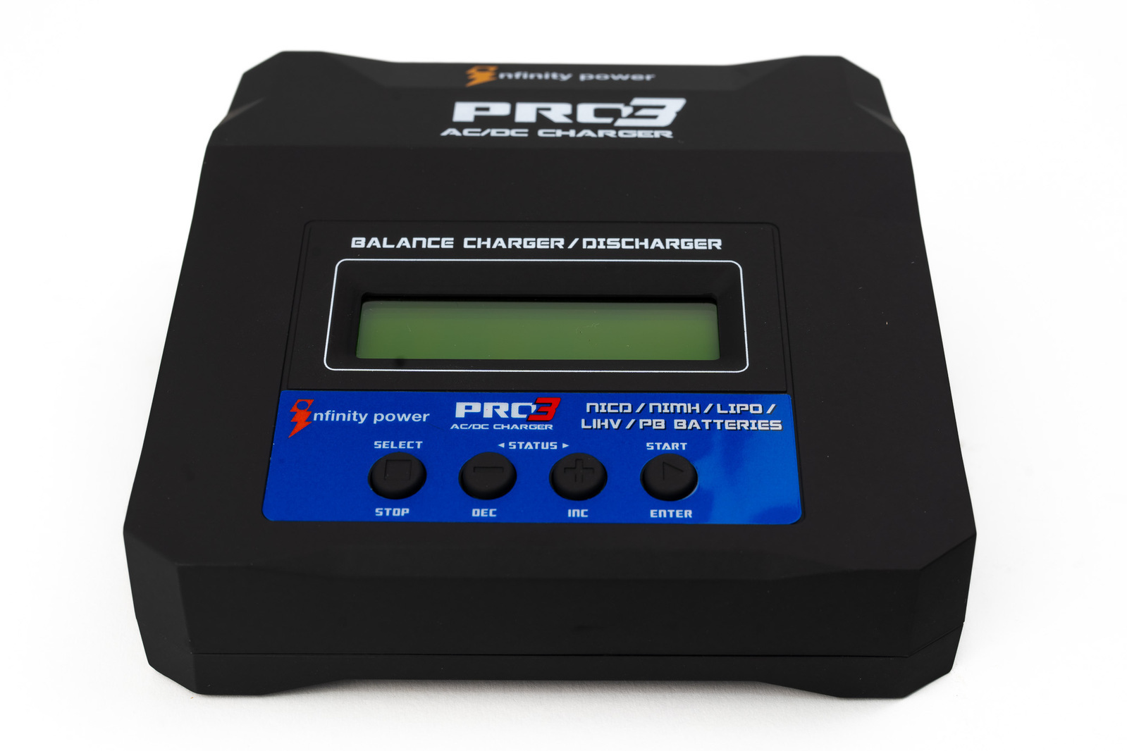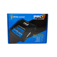 The Infinity power Pro3 charger offers excellent features and capability for almost any hobby charging application. This charger offers both balancing and discharging features for most common battery types. The charger is also 12v capable for when a wall plug is not avaialble. Charge leads for Deans T-Plug, JST, Glow plugs and 3 pin Futaba are included in the box.