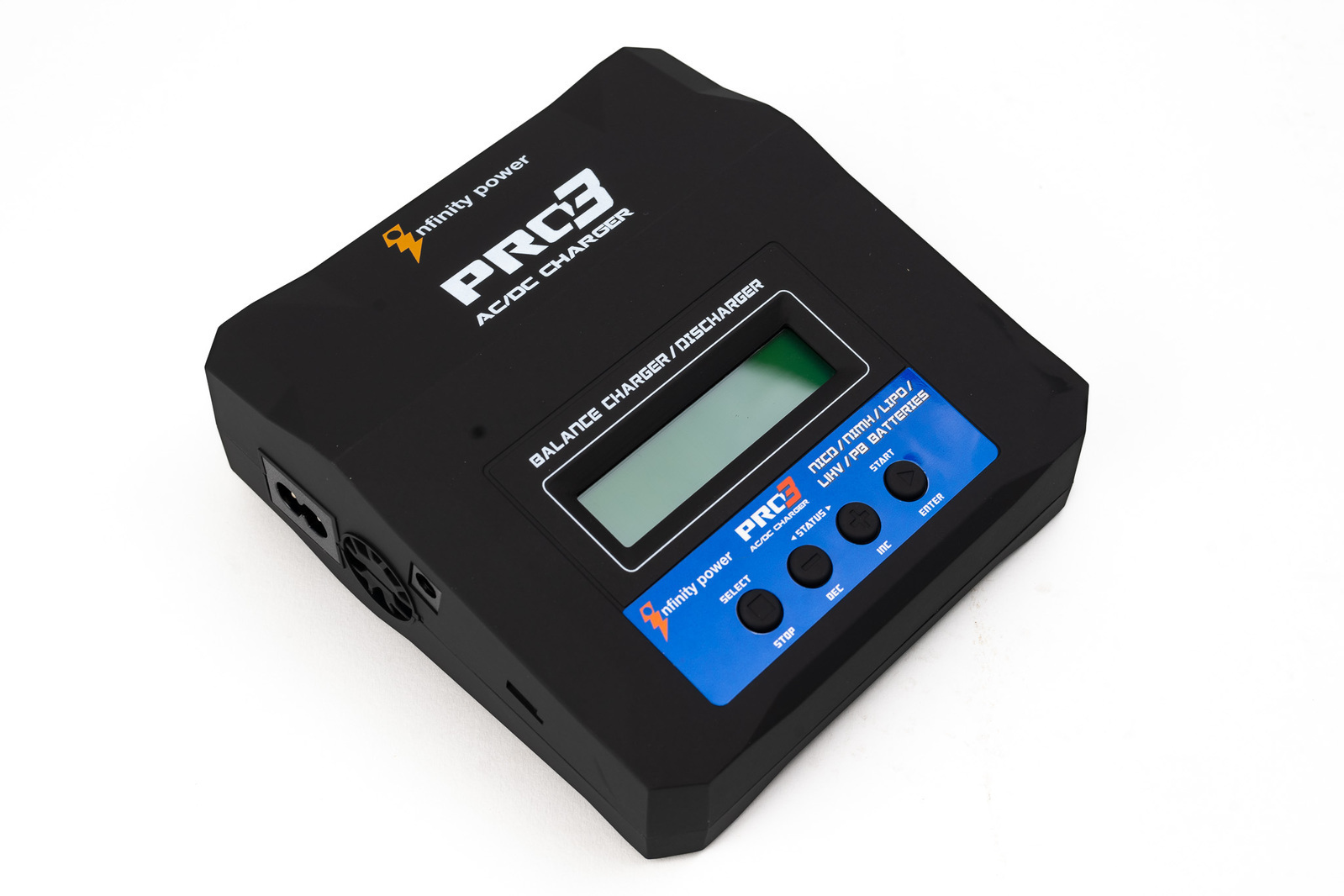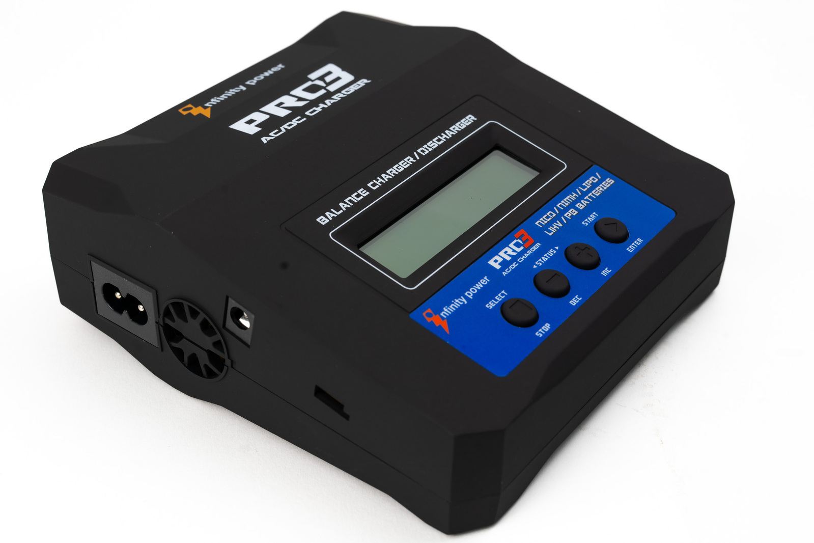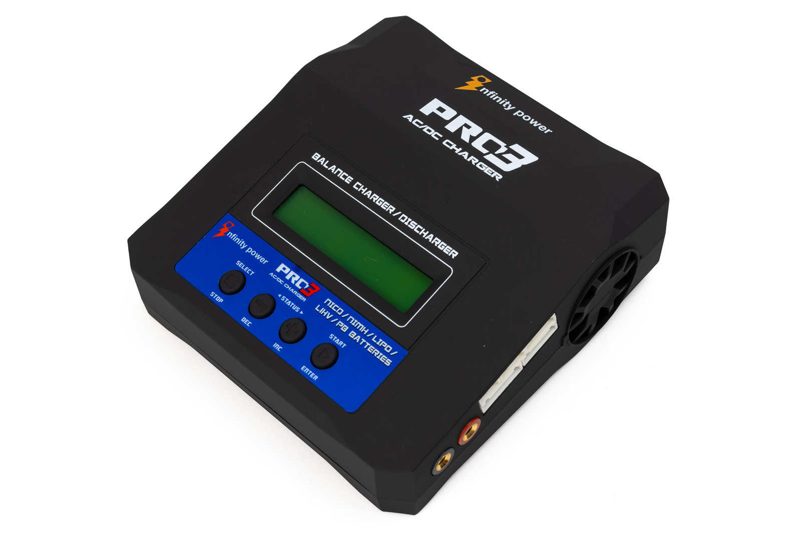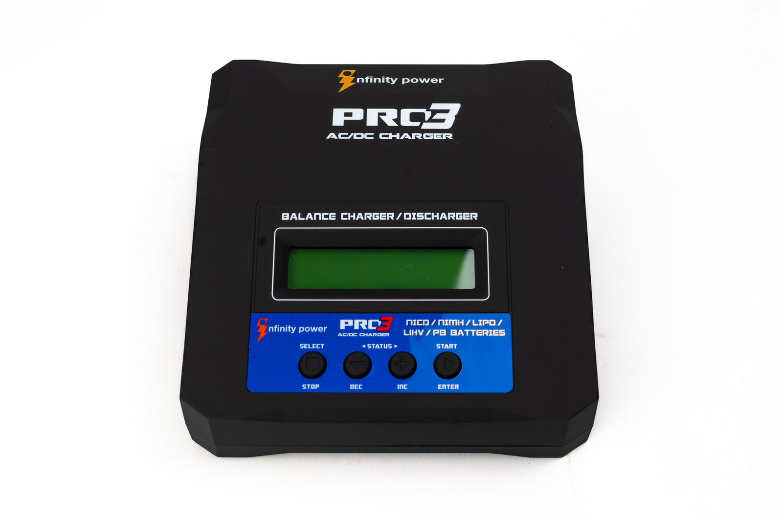 The Infinity power Pro3 charger offers excellent features and capability for almost any hobby charging application. This charger offers both balancing and discharging features for most common battery types. The charger is also 12v capable for when a wall plug is not avaialble. Charge leads for Deans T-Plug, JST, Glow plugs and 3 pin Futaba are included in the box.