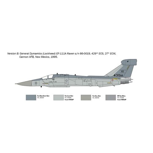 The General Dynamics EF-111 Raven was developed on the aerodynamic platform of the ground-attack aircraft F-111 Aardvark. The supersonic aircraft, featuring variable-geometry wings, was identified as a suitable platform to accommodate the electronic components necessary to effectively perform the new assigned tasks. The EF-111 Raven thus became a benchmark for Electronic Warfare missions, being employed in various operational activities in Libya, Bosnia, and Iraq. Easily recognizable by the prominent protrusion on the rear fin, it was equipped with state-of-the-art electronics for its time, including terrain-mapping radar and the adoption of radar jamming systems and electronic countermeasures. The cockpit was also redesigned with the installation of a control suite specifically configured for the Electronic Warfare Officer (EWO), the officer specializing in electronic warfare. What's in the box? Plastic kit Instruction sheet Decal Sheet