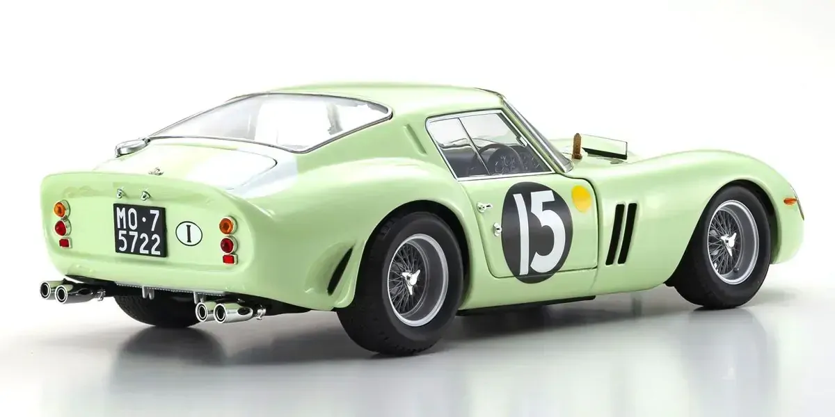 The second model is the No. 15 Ferrari 250 GTO, with chassis number 3505GT, featuring an eye-catching pale green body. This car won the 11th round of the World Sportscar Championship, the Goodwood Tourist Trophy, on August 18, 1962. Notably, it was the first right-hand-drive 250 GTO, a detail faithfully replicated in this mini car model. The car was originally ordered by none other than Sir Stirling Moss, though it was driven to victory in the final race by Innes Ireland.