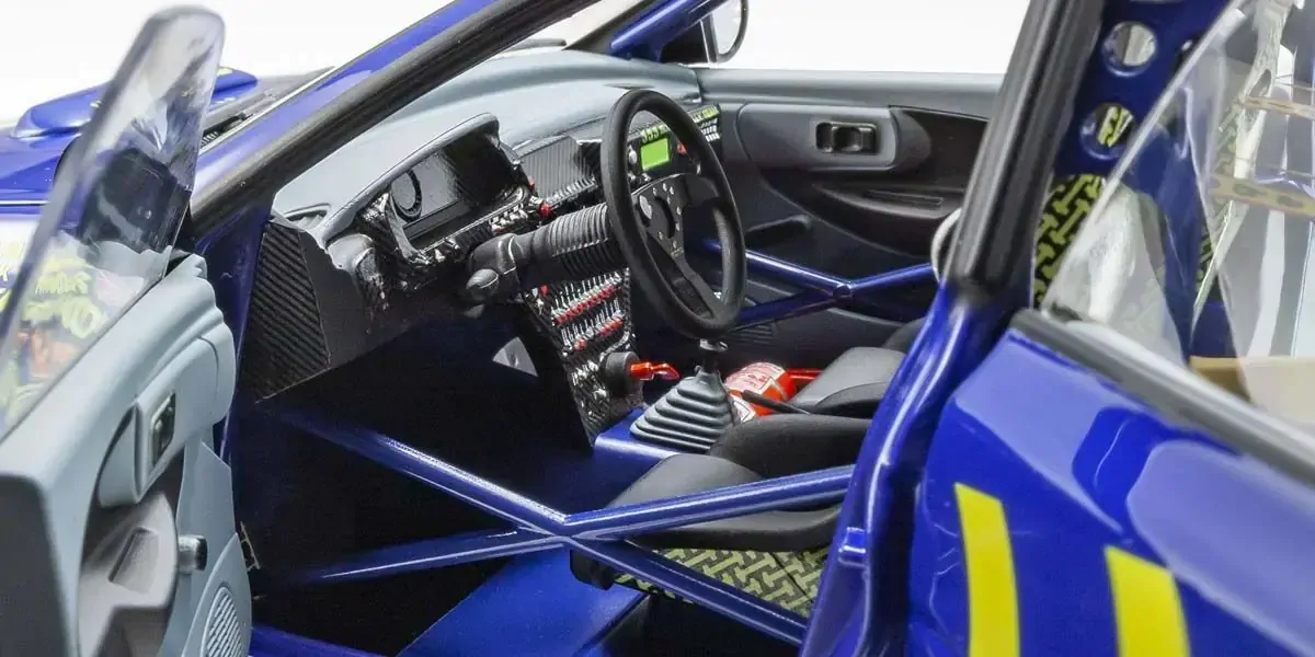 The roll cage, also known as a jungle gym, has a smaller diameter and is scaled down without compromising the look and feel of the actual car. The gusset welding has also been realistically reproduced. This photo shows a prototype so some parts such as carbon pattern on the back seat are different from the finished product.