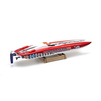 Kyosho Hurricane 900VE Brushless Radio Control Boat You won’t believe your eyes at this stunningly realistic recreation of a C-1 class catamaran. Built to an interior display standard, you cannot help but admire the sleek form and the high-quality finish. However, the HURRICANE 900VE is not known just for its scale appearance. Setting the benchmark for 900mm class electric racing boat performance, the precision-crafted pre-painted FRP hull is the embodiment of KYOSHO’s many years of R/C boat design know-how and incorporates the latest KYOSHO SPEED HOUSE water-cooled brushless motor and water-cooled ESC with maximum current of 120A. Combined with the precision angle of the wire drive, the hull accelerates from a standing start with minimal cavitation from the propeller to its planning posture in next to no time. Speed increases quickly after the lift from the initial acceleration as the characteristics of the low-profile catamaran hull design deliver high-speed performance across the water. Specifications of the Readyset produce enough speed and performance to compete without modification. However, with optional parts such as the metal propeller (BPMC440-3), top speed can reach up to 75km/h. Packaged as a Readyset puts this advanced design and pure racing boat features within easy reach for anyone. Fully assembled, the HURRICANE 900VE is pre-installed with the high-performance 2.4GHz Perfex KT-231P+ R/C system. Add your own Li-Po battery and charger and the latest in topline EP racing boats is at your fingertips. The HURRICANE also makes a great step up from beginner EP racing boats too. Experience the power and performance of this high-end racing boat for yourself! Features: Factory assembled precision-built FRP hull is complete with coloring. Pre-installed KYOSHO SPEED HOUSE 40x68mm large water-cooled brushless motor. Pre-installed KYOSHO SPEED HOUSE 120A water-cooled, waterproof ESC. Machine cut CNC aluminum drive brackets enable adjustment of running posture. Machine cut CNC aluminum flip-up water intake rudder. Equipped with high-torque rudder servo. Includes drip-proof rubber boots, aluminum servo mount, carbon nylon 3-blade screw (with spare). Specs: Length: 945mm Width: 230mm Weight: 2,350g Motor: KYOSHO SPEED HOUSE TORX M6 water-cooled brushless motor (40x68mm, KV1250) Battery: 2 x 3 cell 11.1V-3600-4000mAh LiPo battery (Super Plug specification, sold separately) R/C System: Perfex KT-231P+ Propeller: D40×P1.4(3-blade) ESC : KYOSHO SPEED HOUSE KA120-91WC 120A water-cooled, waterproof brushless ESC Requires: 22.2V 3600-4000mAh LiPo battery w/Deans Style Connectors (2 x 3S) Suitable Charger 4 x AA's for Transmitter