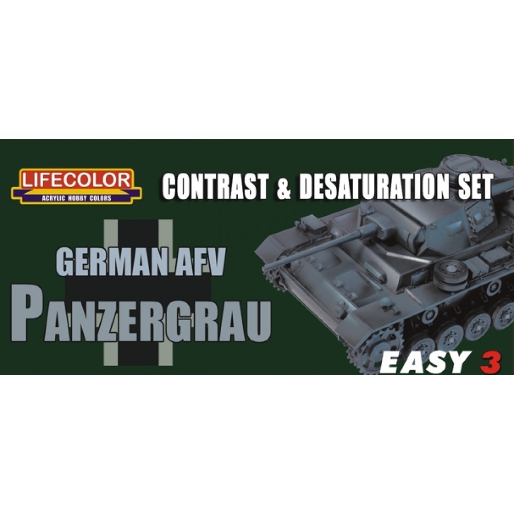 Three special acrylic colour with a high pigment concentration for finishing models In Panzer Grau colour with innovative and vivid painting technique of color desaturation. With each set you have three different techniques of painting: overhead light, the central light and the spotting one.The mixture of pigments and their skillful balance make their mixture particularly effective, thus allowing a perfect colour gradation.