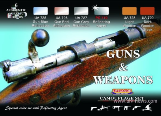 This colour set can be used to paint light weapons and metallic parts. It contains two wood shades, three base colours for metallic surfaces and one special pot of Reflecting Agent.