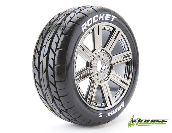Louise RC - B-ROCKET - 1-8 Buggy Tire Set - Mounted - Soft - Black-Chrome Spoke Wheels - Hex 17mm - L-T3190SBC