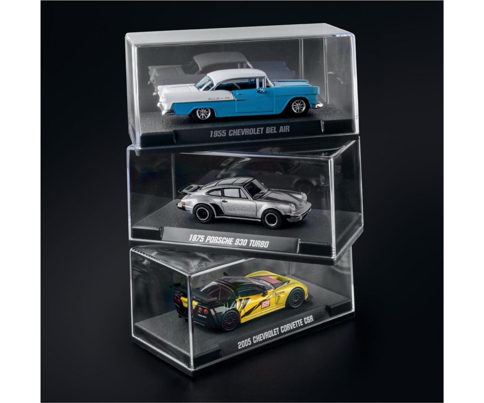 With this special edition, we make a statement for all fans of iconic vehicles: these carefully selected model cars bring back unforgettable classics from the eras 1955 to 2005 – featuring premium details such as a metal chassis, rubber tires, separately fitted headlights, printed side mirrors, and a showcase display case.
