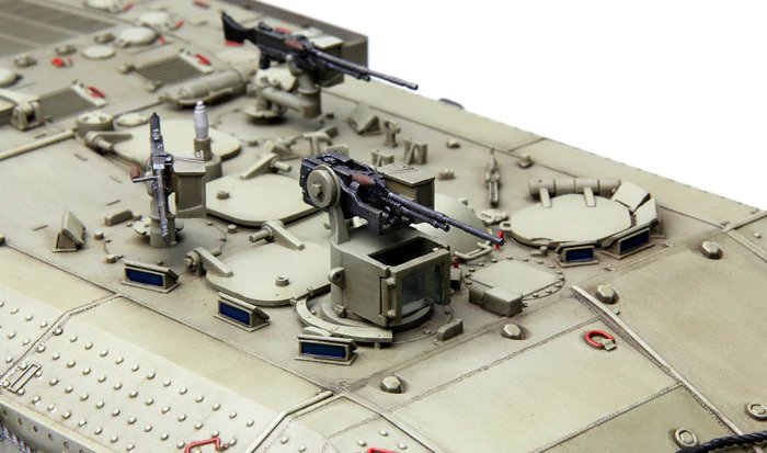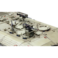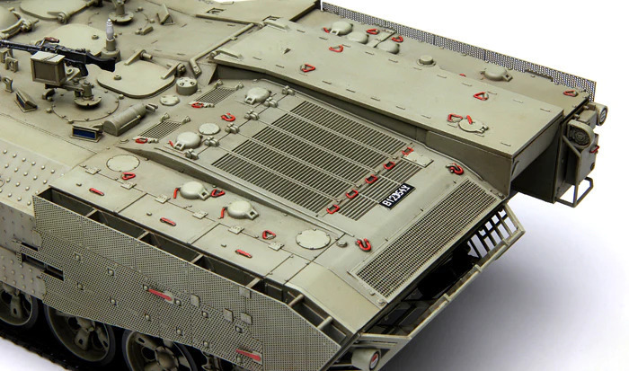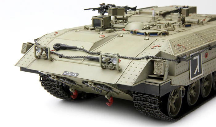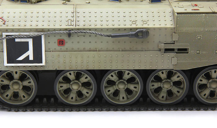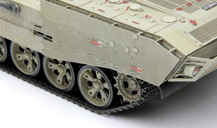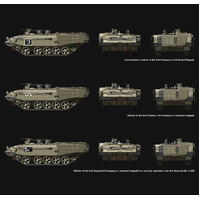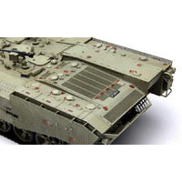 This 1/35 scale Israel Heavy Armoured Personnel Carrier Achzarit Early plastic model kit perfectly replicates this tank-based heavy APC. Periscopes and lights are provided with clear parts. All hatches can be built either open or closed. All grilles/louvers of the engine compartment are presented in precision PE parts. One-piece TPE tracks are easy to assemble. An Achzarit heavy APC model with T-55 MBT road wheels can be made.