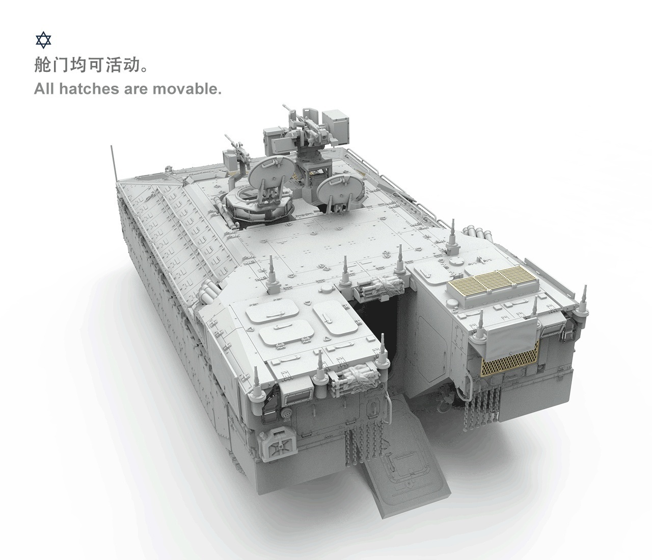 With the help of Lt. Col. (res) Michael Mass who’s the curator of the Latrun Armored Corps Museum, MENG now releases this SS-018 1/35 Israeli Heavy Armoured Personnel Carrier Namer model kit. The finished model will be 259.7mm long and 115mm wide.